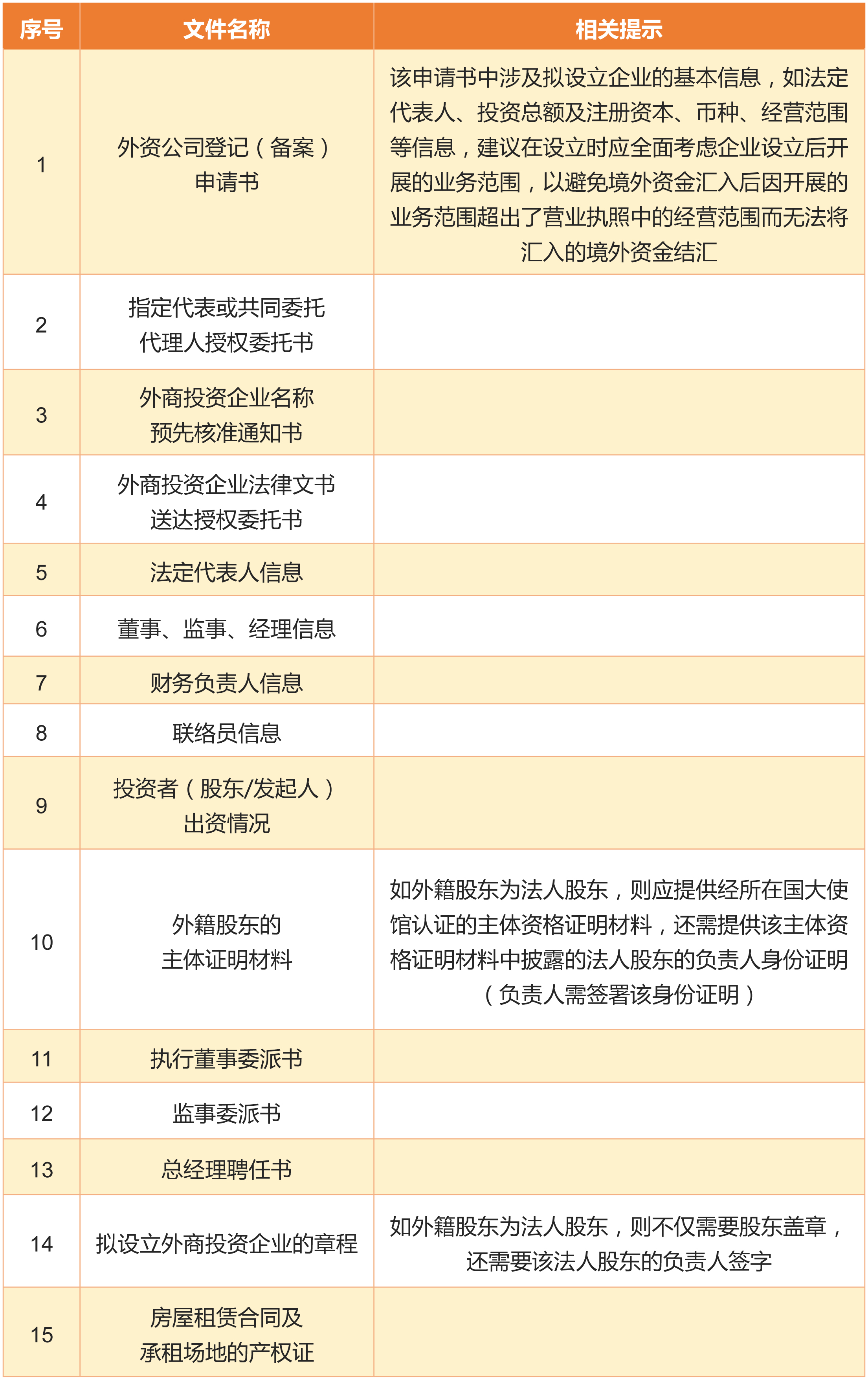 外国企业启动在中国境内设立外商投资企业的程序,应首先通过拟设立外商投资企业所在地的工商局进行工商登记程序。因各地工商局对于外商投资企业的设立程序所涉及到的表格填写及办理时间长度有差异,故建议在启动设立程序之前,应前往当地工商局全面了解所需填写的文书类型及模板、时间长度以及需要提交的支撑文件。下面,以笔者所承办的一个案件为例,列明设立外商投资企业程序中应提交的文件明细,仅供参考:
