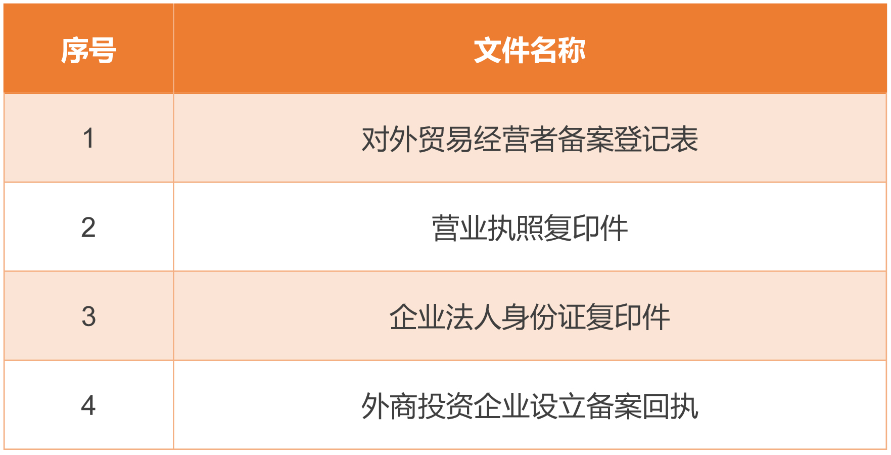 如设立的外商投资企业涉及到从事货物进出口或技术进出口的对外贸易经营,则应在完成商务委备案程序之后,及时完成对外贸易经营者备案登记,具体程序应按照“商务部业务系统统一平台”中“对外贸易”版块的指引进行网上登记操作。下面,以笔者所承办的一个案件为例,列明对外贸易经营者备案登记应提交的文件明细,仅供参考: