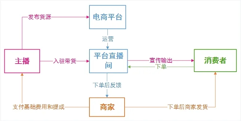 该种模式是比较原始的模式。主播在电商平台的直播间带货宣传,消费者根据主播的导购在电商平台下订单;下订单后,商家(供货商)向消费者发货,主播向商家收取基础费用,或在销售额中收取佣金。如李佳琦在网上带货,消费者在淘宝下订单,商家发货。除了商家发货的模式外,主播有时也会自行购入货物,这样的情况下主播同时也是商家。