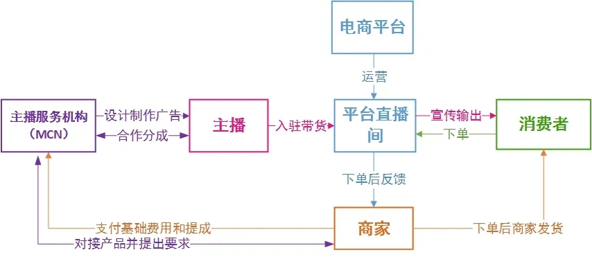 随着直播带货行业的迅速发展,主播服务机构MCN开始崛起,这些机构主要是培训带货主播,负责直播带货的策划、宣传和文案准备,部分主播服务机构控制了货源和直播安排等直播现场之外的诸多运营事宜,主播仅负责直播的环节,主播服务机构、主播及商家按约定分享收益。