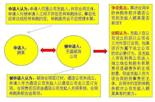 《公司法司法解释(三)》第三条规定:“发起人以设立中公司名义对外签订合同,公司成立后合同相对人请求公司承担合同责任的,人民法院应予支持。”该条并未明确规定在该等情况下公司发起人无需与公司共同承担合同责任。本案中,某酒店公司发起人顾某和贾某,在酒店公司设立阶段以该公司名义与装饰公司签订施工合同,该行为属于设立公司非必要行为,且顾某和贾某存在利用公司法人独立地位和股东有限责任逃避债务的主观故意,应承担装修合同项下合同义务,包括合同约定的仲裁条款。仲裁委员会认定装修合同约定的仲裁条款对公司发起人顾某、贾某具有约束力并无不当。裁定驳回顾某申请。