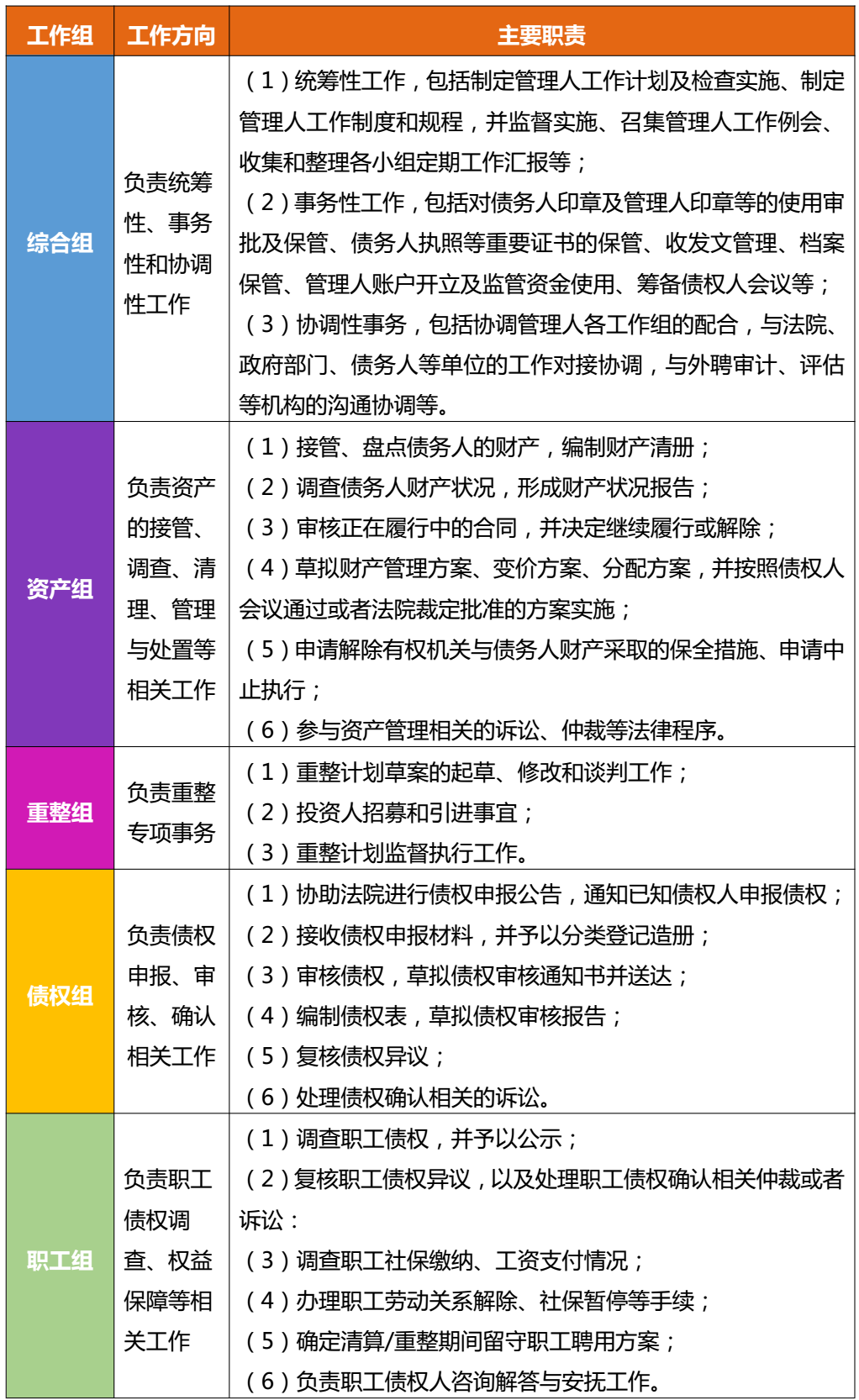 我们在多年的破产案件办理实践中,根据职责内容,特别是对于重大复杂破产重整案件的办理,形成了一套能够涵盖管理人所有职责的科学分工方案,具体为: