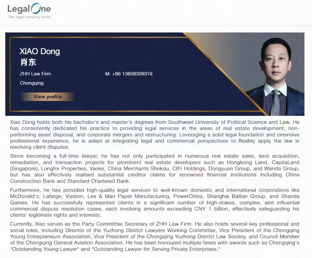 肖东律师执业多年来,长期专注于房地产法律服务领域,擅长房地产开发全流程、商业地产运营、城市更新、基础设施建设、跨境地产投融资等核心业务,尤其在复杂项目的合规架构设计、交易风险防控及争议解决方面积累了丰富经验。曾为多个大型房企以及城市综合体项目提供合规架构设计、交易风险防控以及争议解决等专业支持,其服务以精准的商业洞察与严谨的法律方案获得客户与行业的双重认可。与此同时,肖东律师还担任中豪律师事务所党委书记、重庆市渝中区律师工作委员会主任、重庆青年企业家协会副会长、重庆市渝中区法学会副会长、重庆市通用航空协会理事等职务,并多次被授予重庆市“最佳青年律师”和“最佳服务民营企业律师”等荣誉称号。