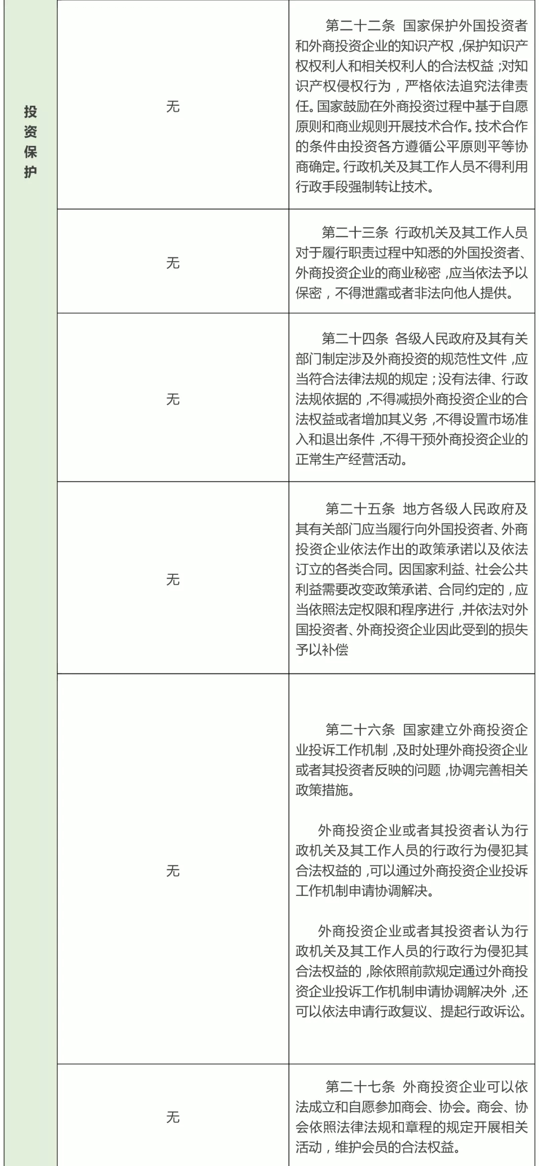 为加强对外商投资合法权益的保护,新法对实务中外国投资者和外资企业极为关注的收益与利润的自由汇出、知识产权保护、政府承诺、行政干预、外商投诉等方面均作出明确规定,这无疑给外国投资者合法权益的保护吃了定心丸。