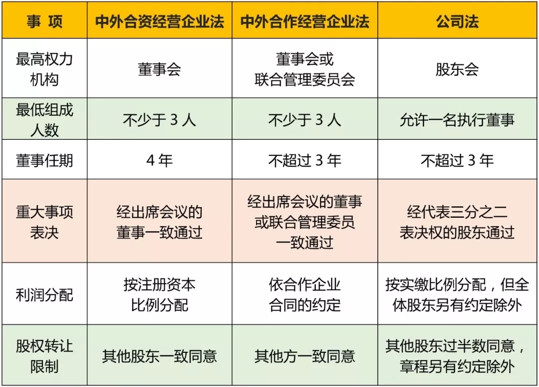 改革开放初期,我国还未制定公司法等配套基础法律,为了引进外资,“外资三法”以及配套的《中外合资经营企业法实施条例》和《中外合作经营企业法实施细则》等法规对外资企业的组织形式进行了规定,规定董事会决定重大事项的设置可能参照了部分英美法系公司的组织形式,同时也是出于提高公司决策效率的考虑。目前,我国《合同法》《公司法》《合伙企业法》等基础法律已经完备,本着内外资一致的原则和精神,新法不再对外资企业的组织形式进行约定,而是参照了我国《公司法》和《合伙企业法》的组织形式。这意味着外资企业的组织形式不再是董事会为决策机构的有限责任公司,而可根据《公司法》和《合伙企业法》成立股份有限公司、合伙企业等形式。“外资三法”对比《公司法》主要变化如下: